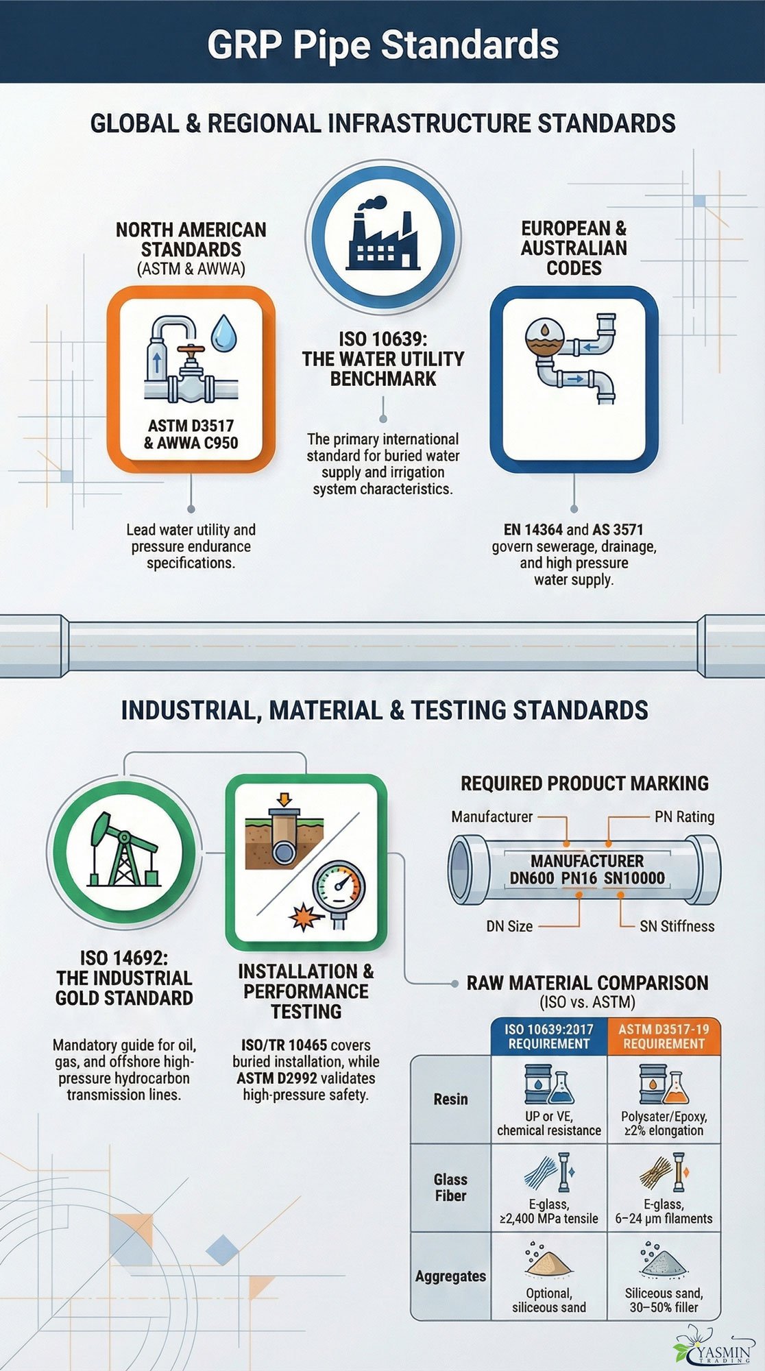 GRP pipes standards guarantee the quality, safety, and function of glass-reinforced plastic pipes, which should apply to water, sewerage, and chemical systems. Standards like ISO 10639 or AS 3571 define material essential properties (resin and glass fiber), manufacturing and jointing methods, testing, and installation. ISO 14692 plays such a role in industrial use cases such as oil and gas pipelines. Additionally, they require marking and labels that last for decades and ease tracking and identifying.