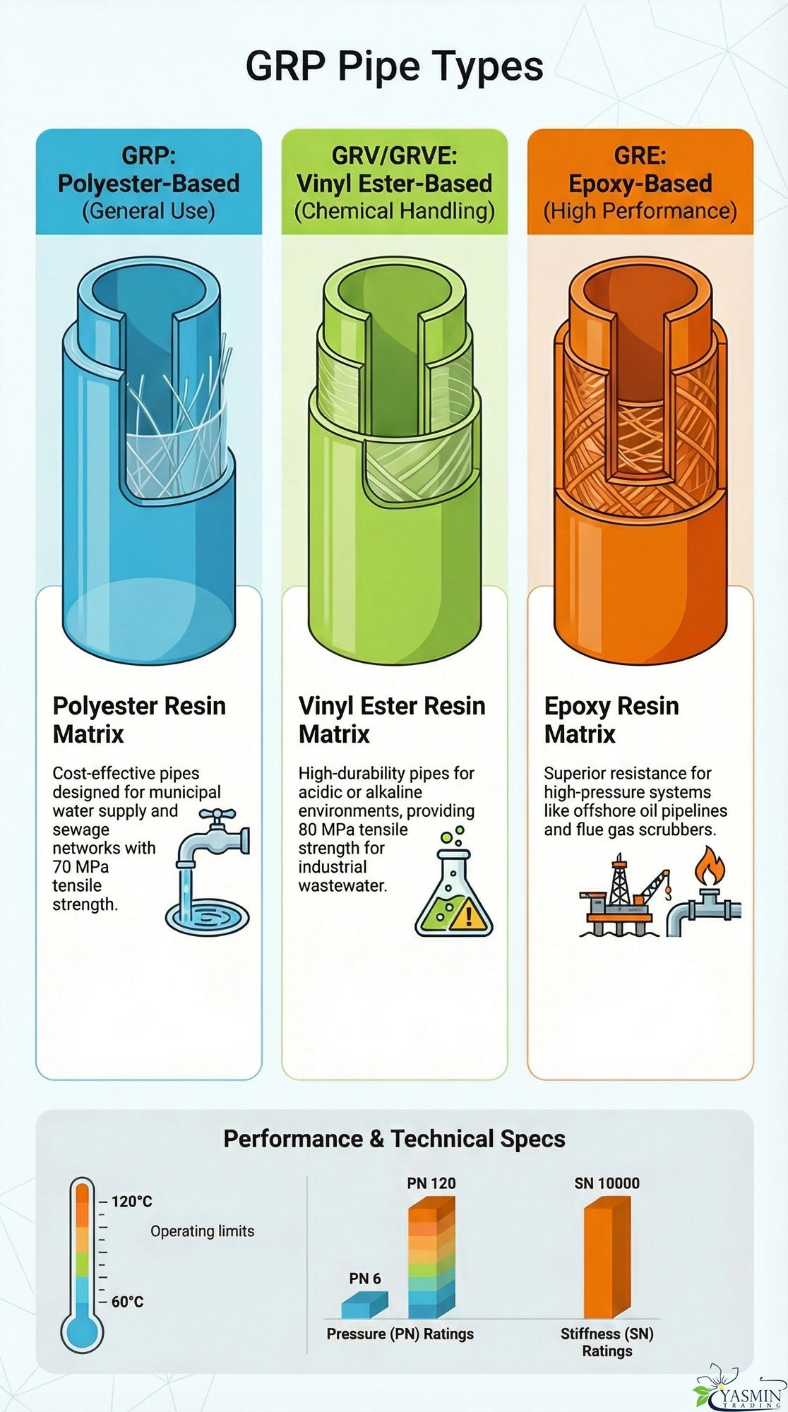 Polyester GRP pipes are manufactured with low to medium PN and SN classes, while vinyl ester GRV has higher ranges, and epoxy GRE includes the highest pressure class and stiffness class for perfect tolerance of pressure and temperature in offshore or industrial piping systems.