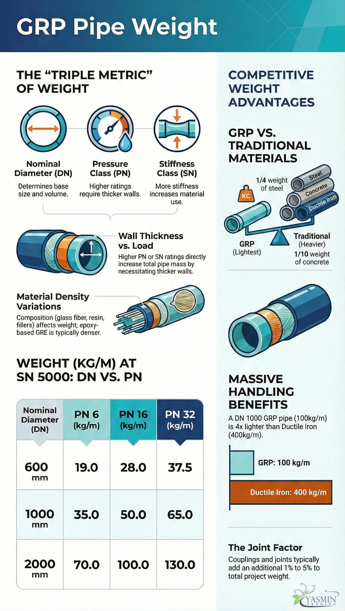 Multiple factors like nominal diameter, pressure class, stiffness class, and material composition (glass fiber, resin, fillers like silica sand) determine how heavy a GRP pipe is.
